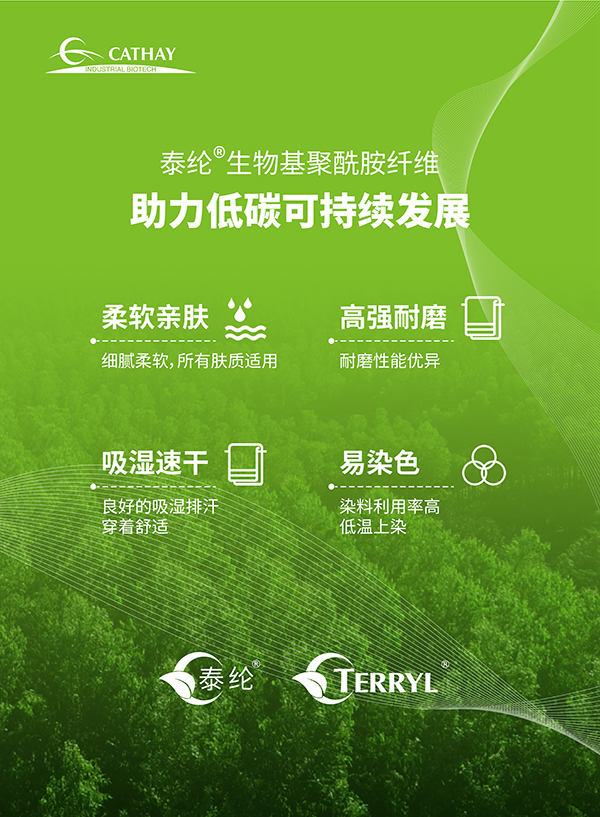 “泰纶®”是凯赛生物面向纺织领域推出的生物基聚酰胺纤维产品品牌,其来自可持续再生的植物性原料,可有效减少石油、煤炭等化石基原料的使用,从根本上降低了碳排放。泰纶®产品的环保性和可持续性不仅体现在原料来源的可再生,亦体现在其整个供应链各环节均可达到可循环再生利用的闭环操作,从而最大限度的节约资源。泰纶®品牌下的各类产品均具有优异的纺丝加工性能,相较于化石基来源的聚酰胺纤维,泰纶®纤维具备优异的耐候耐磨、柔软亲肤、吸湿速干、低温易染等特性。